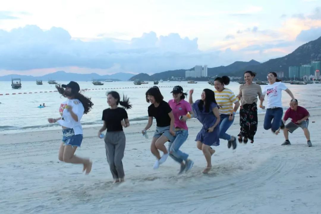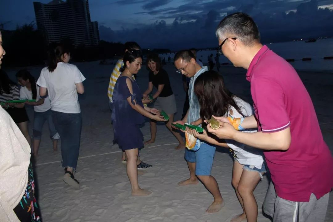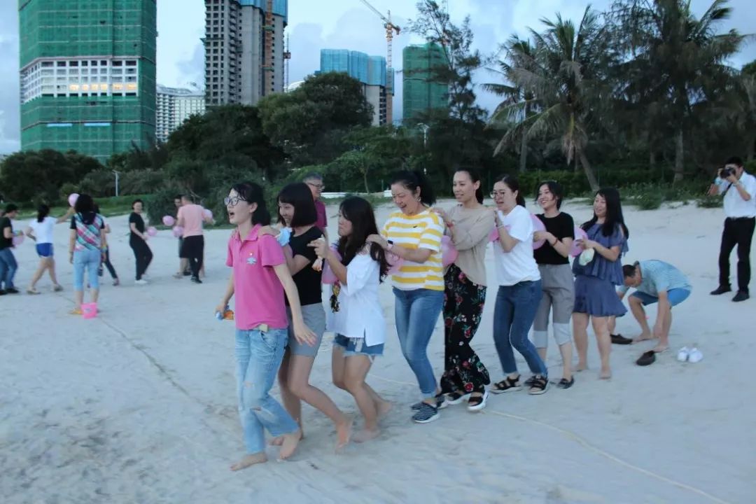 團建比賽精彩紛呈,通過“愛的抱抱”破冰活動組合而成的“海鷗隊”、“先鋒隊”、“海盜隊”三支隊伍,各自以別致的隊型“出道”,卻也擰成了一股繩,在真正的拓展培訓比賽中你來我往,爭先恐后,奮不顧身,表現出勇于挑戰、敢于擔當的磅礴氣勢。跳長繩,夾氣球,運沙水,珠行萬里,一個接一個的挑戰,大家配合默契,一氣呵成。中途即使遇到小坎坷,大家齊心克服,互補互助,完成任務后的舒爽一笑,一身疲憊消散在海風中。